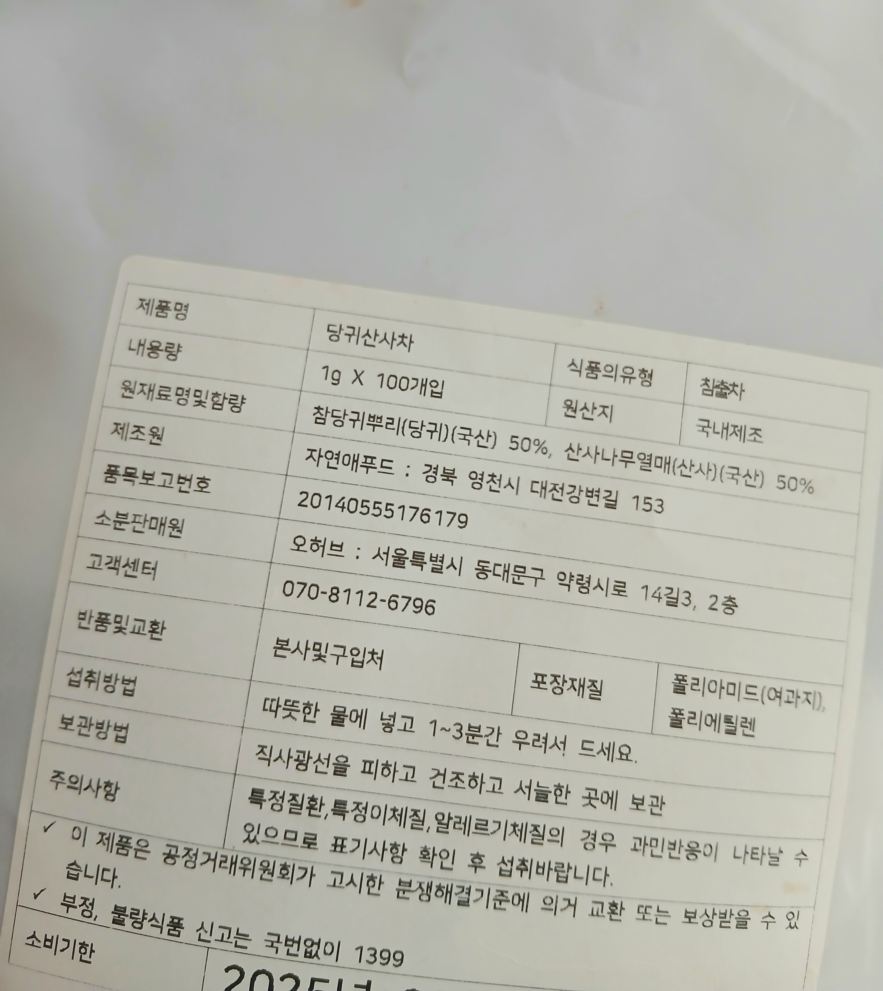 ▶ 원재료명 및 함량: 참당귀뿌리(당귀/ 국산) 50%, 산사나무열매(산사/ 국산) 50%